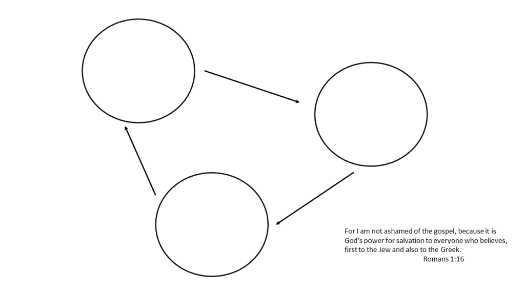 This is the gospel explained by three circles. While there are many ways to share the gospel; I have chosen this one for our students to learn. I believe it does a great job of helping us understand why we need Christ as our Savior and why we make the choices in life that we make. Students should be able to draw and label the three circles as shown in the video here.